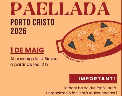 La Paellada 2026 ja és aquí!. Ens trobam divendres 1 de maig al passeig de la Sirena de Porto Cristo, a partir de les 12 h, per compartir un dia de bon menjar i millor companyia!. Inscripcions obertes fins dia 24 d’abril a l’Oficina Municipal o al 971 82 09 31. Recordau dur fogó i butà! L’organització posarà taules, cadires i una garrafa d’aigua.
